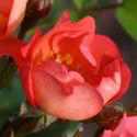 Заостренные бутоны раскрываются в маленькие (3-4 см в диаметре) простые немахровые цветы с кокетливыми волнистыми по краям лепестками. Только распустившиеся цветы насыщенного лососево-оранжевого цвета с яркой короной золотистых тычинок в светлой серединке, с возрастом цветка окрас меняется на оранжево-розовый и затем нежно-розовый цвет, от чего цветущий куст выглядит игриво и радостно. Цветы долго держатся на кусте, очень устойчивы к дождю и яркому солнцу. Цветы появляются в небольших кистях по 5-10 штук. Источают слабый сладковатый аромат.